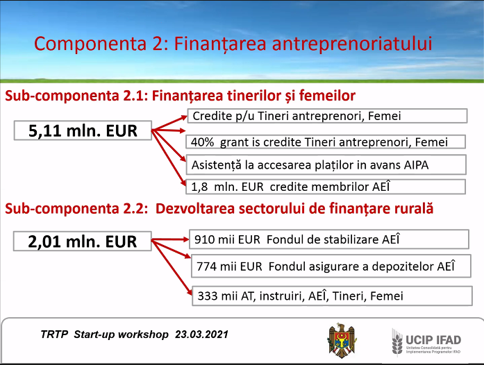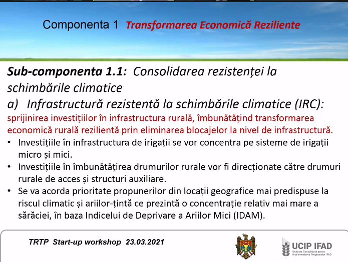 „Lansarea noii investiții marchează o modalitate îmbunătățită de implementare, bazată pe experiența obținută anterior. Obiectivul strategic al IFAD în Moldova este divizat în 5 compartimente. Colaborarea fructuoasă dintre IFAD și Guvernul Republicii Moldova a început în anul 1999 și până la moment au fost susținute și implementare 8 proiecte cu valoarea totală de aproximativ 3 milioane de dolari, jumătate fiind cofinanțare din resursele IFAD. Republica Moldova rămâne o țara privilegiată și va putea beneficia de suportul financiar din partea IFAD și în continuare. Bugetul total al noului Proiect va constitui circa 50, 5 milioane de euro. Din valoarea totală a investiției, contribuția IFAD va constituit 20, 7 milioane de euro”.
