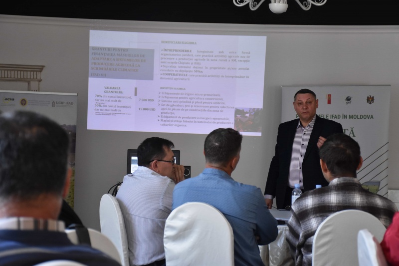 Dl. Alexandru Belschi, Specialist Fondului de Adaptare UCIP IFAD a expus tuturor prezenți la acest eveniment scopul şi obiectivele proiectului, care constau în stimularea creșterii economice rurale pe scară largă și reducerea sărăcia prin investiții complementare în dezvoltarea infrastructurii şi irigării la scară mică, cu acces garantat pentru ariile vulnerabile la schimbările climatice. valoarea necesităților de investiții la irigare și de asistența care poate fi oferită grupurilor clienți cât și beneficiarilor individuali în pregătirea setului de documente pentru accesarea granturilor, elaborarea schiței de proiect și componentele sistemelor de irigare.