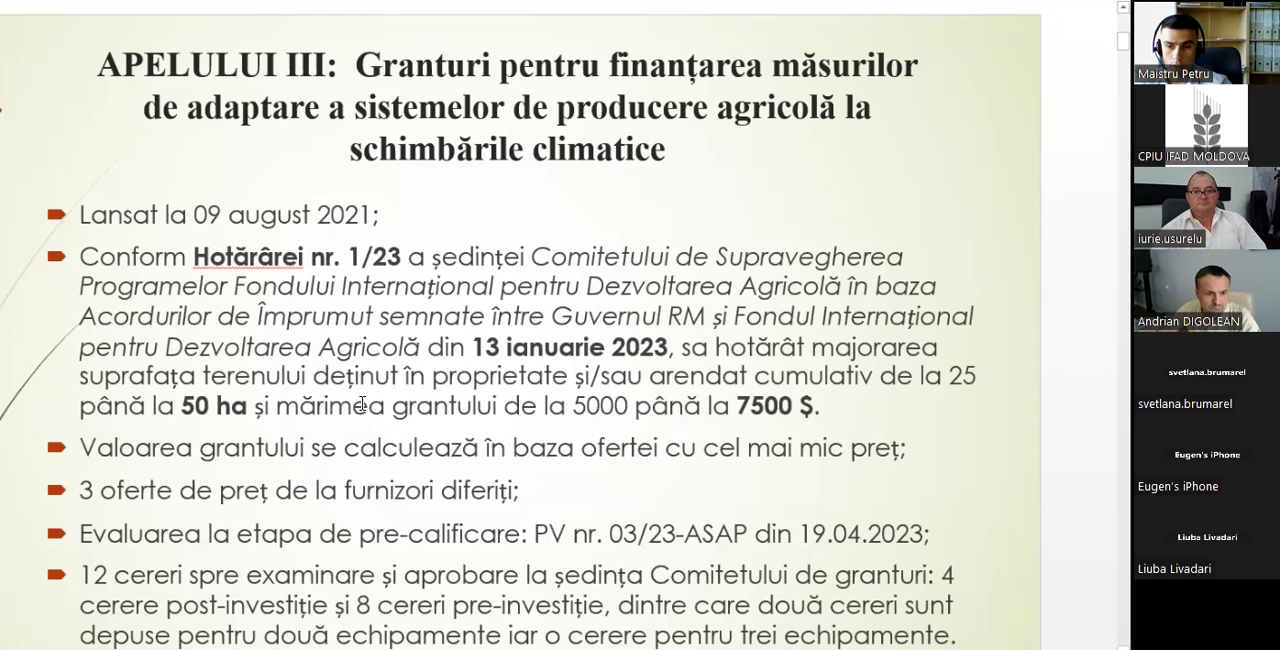 La data de 6 iunie curent, în cadrul Unității Consolidate pentru Implementarea Programelor IFAD (UCIP IFAD), în format on-line, a fost organizată ședința Comitetului de selectare a beneficiarilor și aprobare a granturilor cu finanțare din Proiectele IFAD, Granturi pentru finanțarea măsurilor de adaptare a sistemelor de producere agricolă la schimbările climatice, finanțat de Fondul Fiduciar al Programului de Adaptare a Micilor Producători (Fondul ASAP).