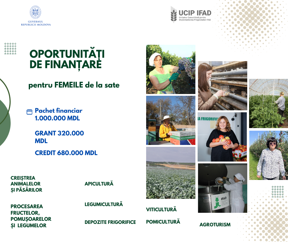 Prin acest produs financiar IFAD, femeile antreprenoare pot accesa finanțare de până la 1.000.000 MDL, care include o componentă de grant de până la 320.000 MDL. Sunt eligibile afacerile care dețin în gestiune până la 10 ha teren agricol și desfășoară activități agricole de producere, post-recoltare, procesare, ambalare și comercializare a produselor agricole, precum și activități conexe agriculturii, cum ar fi panificația, serviciile pentru agricultură, agroturismul sau artizanatul.
