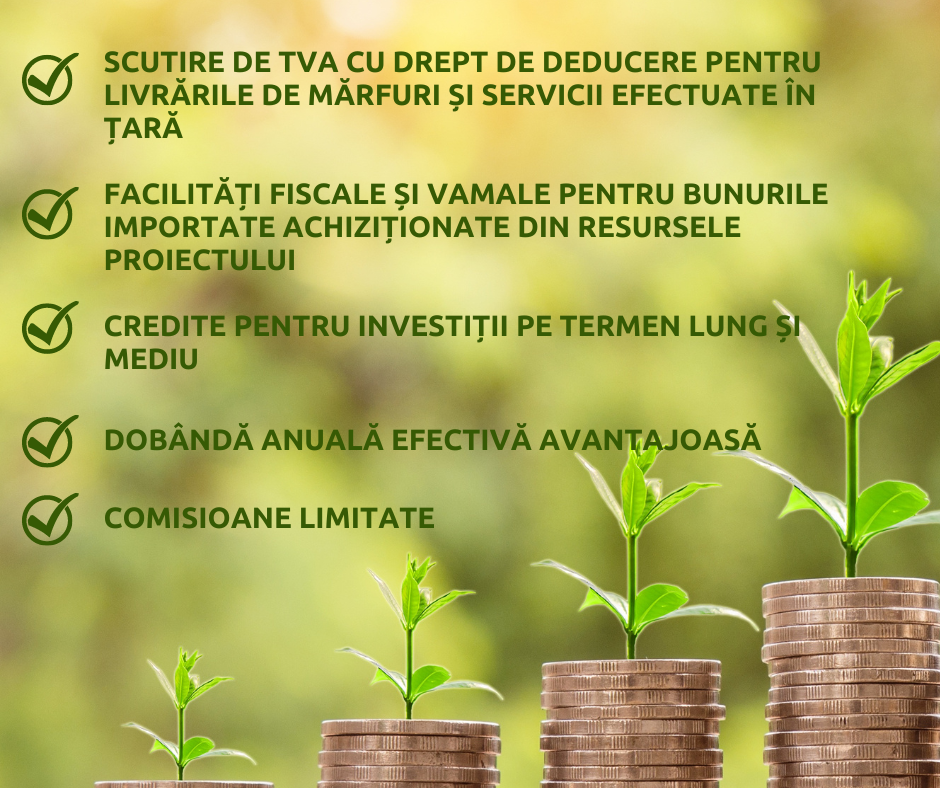 Creditele oferite în cadrul Proiectelor IFAD aduc beneficiul scutirii de TVA pentru livrările de mărfuri și serviciile efectuate în țară, iar aceasta poate reduce costurile și îmbunătăți profitabilitatea fermelor. Proiectele IFAD oferă facilități fiscale și vamale pentru bunurile importate, ceea ce poate duce la economii semnificative pentru fermieri atunci când achiziționează bunuri necesare din surse externe.